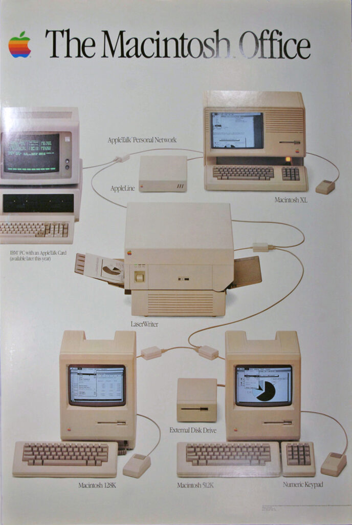 The LaserWriter was the key piece of a larger effort, “The Macintosh Office,” to make the nascent Mac more appealing to the business market. That effort can perhaps best be summarized by a poster Apple put out at the time: