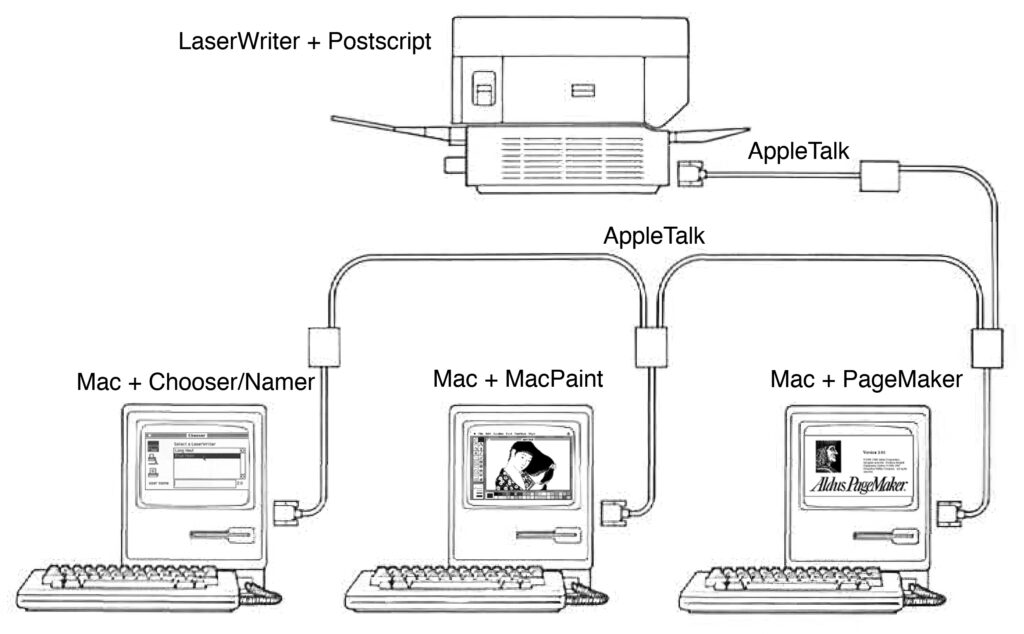 Desktop Publishing: Macintosh + LaserWriter + Postscript + AppleTalk + PageMaker. That was the formula. The rest is history.