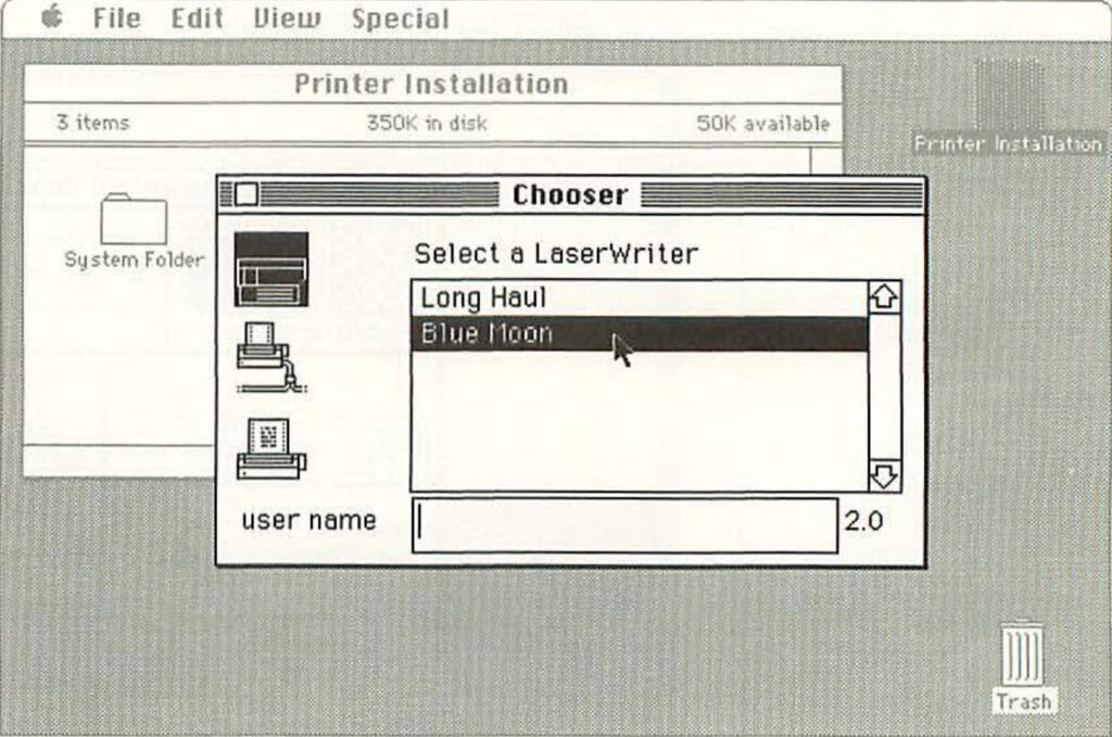 PS (yes, postscript). AppleTalk and the LaserWriter, like the Mac, were designed to be “plug and play” (in fact we may have invented the term). In particular, users never had to type in the name of the device they were using. Instead they ran utilities like the Chooser which used an AppleTalk-invented feature to determine and list the names of available devices, which users could then choose from. If users had had to type in the name of their LaserWriter, this solution wouldn’t have worked.