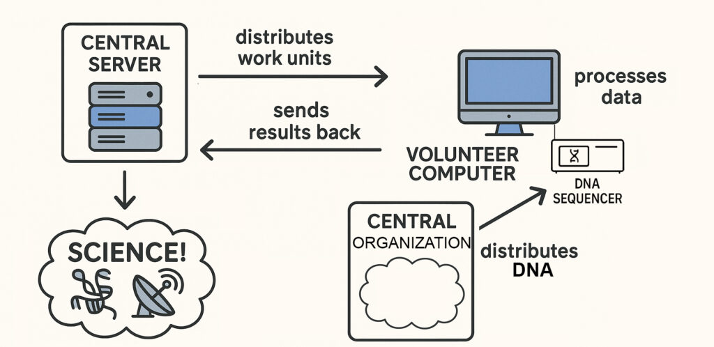 The internet has been a boon to science in many ways. One in particular is “crowdsourcing.” SETI@home utilized volunteers’ internet-connected home computers in the Search for Extra-Terrestrial Intelligence (SETI). Folding@home similarly worked on the difficult but important problem of figuring out how a protein will fold based on the DNA in the gene that codes for that protein.